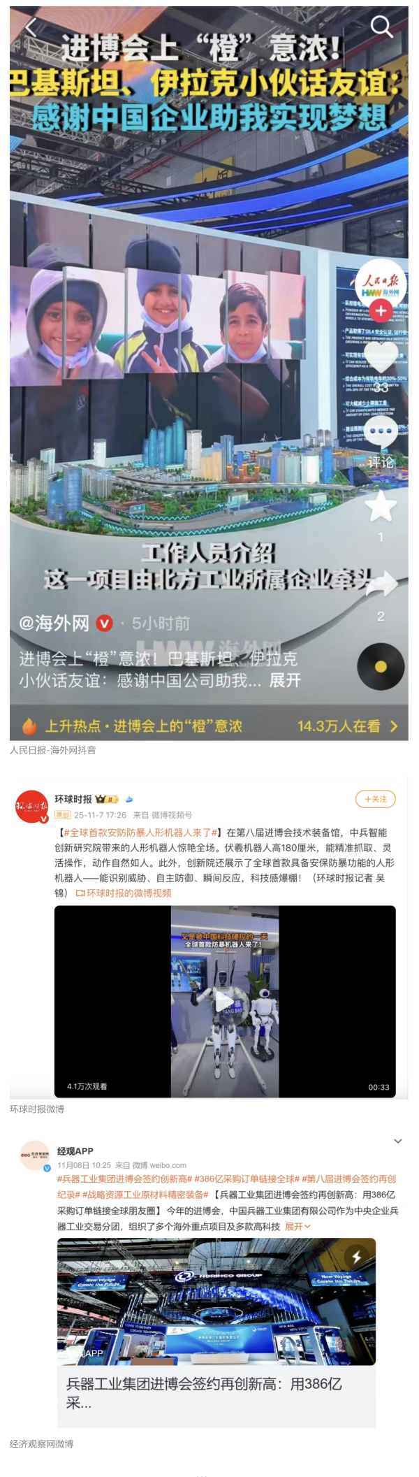 11月5日至10日,中國兵器工業集團有限公司組團參加第八屆中國國際進口博覽會。集團公司以“堅持合作共贏,推進高水平對外開放,助力構建新發展格局”為目標,圍繞“新征程,共創未來”主題組團參展,集中展示了一系列新技術、新理念、新成果,取得豐碩成果,受到廣泛關注。 嘉賓云集 本屆進博會上,蒙古國駐華大使、贊比亞礦業和礦產開發部常任秘書、津巴布韋首席司長等多國政要蒞臨集團公司組展展區,了解有關項目情況。 國家能源集團、東風汽車、哈電集團、鞍鋼集團、中鋁集團、通用技術集團、中國中車、中國長安汽車、中國電建等央企領導,工信部、國務院國資委、中國貿促會、陜西省、上海市、浙江省等國內政府部門領導以及國內外合作伙伴蒞臨集團公司組展展區參觀指導。對集團公司高質量共建“一帶一路”,與各國合作伙伴共享發展機遇、實現互利共贏給予高度評價。 媒體關注 集團公司集中簽約亮相央視綜合頻道《新聞聯播》、央視新聞頻道《朝聞天下》《新聞30分》《共同關注》、央視財經頻道《正點財經》《經濟信息聯播》。 《環球時報》、環球網、《新京報》、《中國旅游報》等對集團公司人形機器人、四足機器人、涵道穿戴式載人飛行器、外骨骼等多型新域新質產品,集中亮相進行報道。新華社、央廣中國之聲、新京報(貝殼財經)、上海廣播電視臺等媒體直播探館,打卡兵器“硬核科技”。 人民日報客戶端、新華社客戶端、人民網、中國網、中國日報網、國務院國資委網站、國資小新微信公眾號、國資小新Facebook、學習強國中央企業學習平臺、經濟觀察網、新京報客戶端等第一時間刊發集團公司組展簽約、ESG建設等情況。新浪財經、界面新聞等商業平臺閱讀量累計超500萬次。 在微博、抖音等新媒體平臺上,集團公司高科技產品演示、5D穹幕電影體驗等短視頻持續引爆流量,累計播放量超800萬次,點贊量破50萬?!氨鞴I集團進博會簽約386億”相關話題登上微博熱搜榜,閱讀量破5000萬次。 文字丨劉暢 |